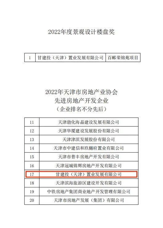 近日,由甘肅建總置業(yè)發(fā)展有限公司天津置業(yè)子公司開發(fā)建設(shè)的百酈榮錦苑項目榮獲天津市房地產(chǎn)業(yè)協(xié)會2022年度景觀設(shè)計樓盤獎及先進(jìn)房地產(chǎn)開發(fā)企業(yè)。