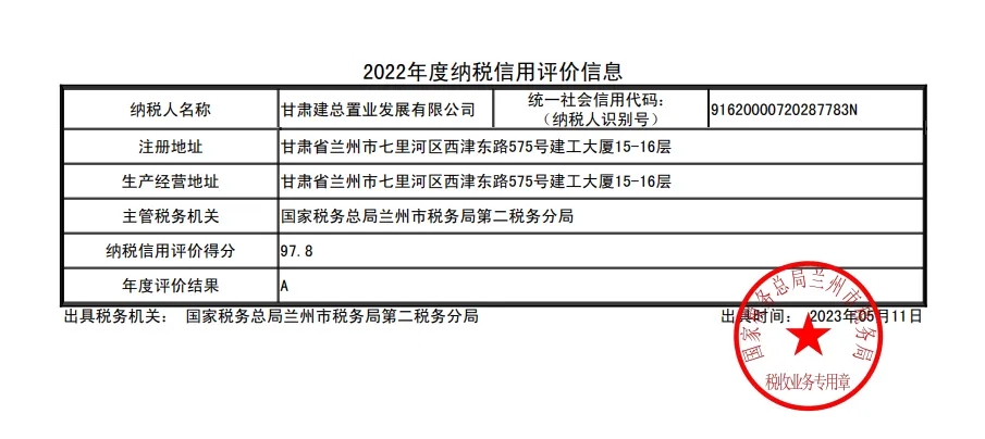近日,在國家稅務(wù)總局甘肅省稅務(wù)局開展的2022年度納稅信用等級(jí)評(píng)定工作中,甘肅建總置業(yè)發(fā)展有限公司獲評(píng)“甘肅稅務(wù)系統(tǒng)納稅信用A級(jí)納稅人”榮譽(yù)稱號(hào)。此次獲評(píng)是置業(yè)公司首次榮獲該榮譽(yù)稱號(hào),為公司融資、審計(jì)等業(yè)務(wù)提供了良好的信譽(yù)保證,進(jìn)一步提升了企業(yè)軟實(shí)力。