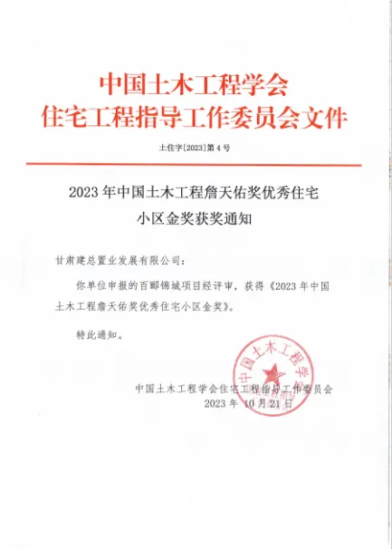 近日,由中國土木工程學(xué)會評選的“2023年中國土木工程詹天佑獎(jiǎng)優(yōu)秀住宅小區(qū)金獎(jiǎng)”公布結(jié)果,甘肅建投地產(chǎn)成都百酈錦城項(xiàng)目憑借其在規(guī)劃設(shè)計(jì)、園林景觀、科技應(yīng)用和工程質(zhì)量等方面的突出表現(xiàn),通過層層評選,榮獲“2023年中國土木工程詹天佑獎(jiǎng)優(yōu)秀住宅小區(qū)金獎(jiǎng)”,甘肅建投旗下四家參建單位榜上有名。